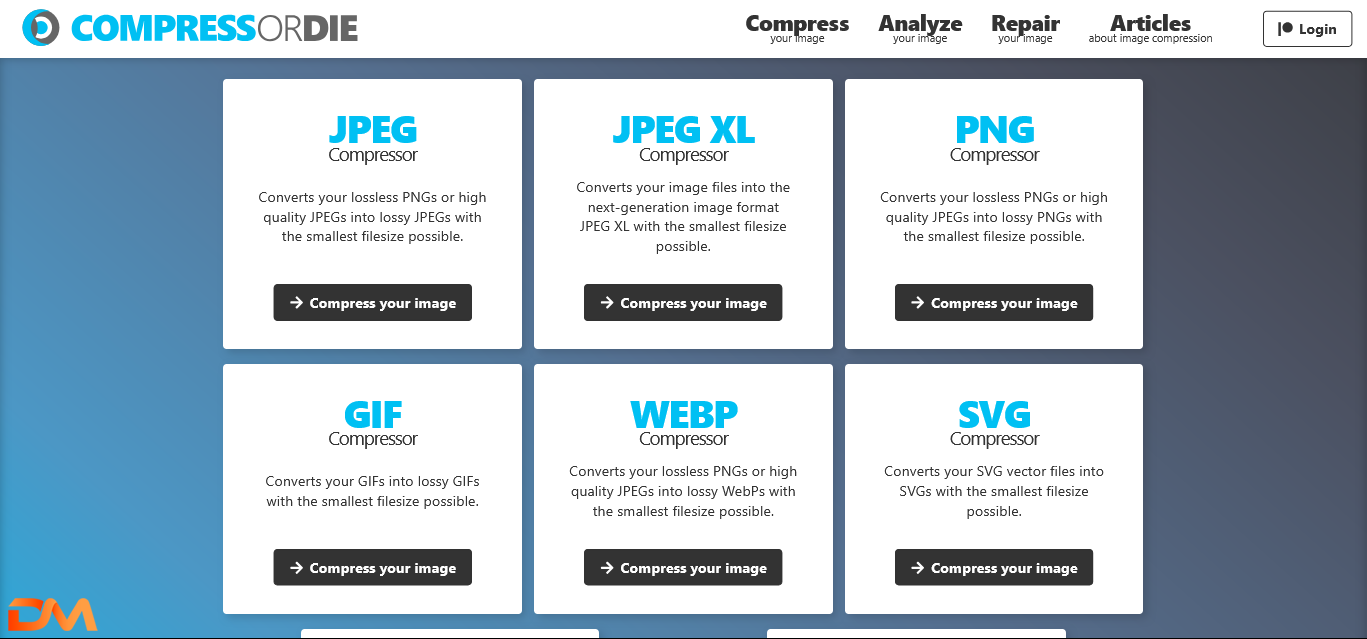 Compress‑or‑Die یک سایت پیشرفته برای فشردهسازی تصاویر با فرمتهای JPG، PNG، GIF، SVG و JPEG XL است. این ابزار امکان تنظیم دقیق پارامترهای فشردهسازی را دارد و کیفیت تصویر را در حد بسیار بالا حفظ میکند.